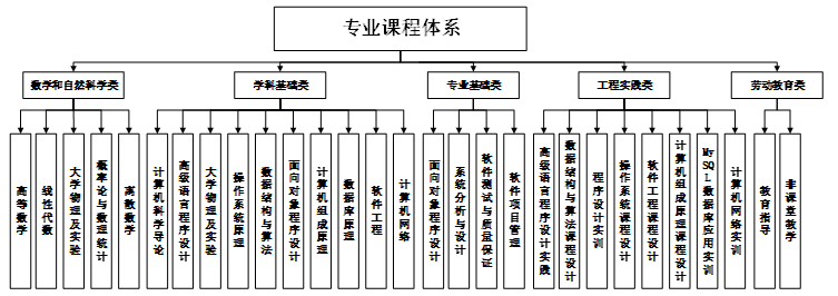 计算机科学导论、高级语言程序设计、操作系统原理、数据结构与算法、面向对象程序设计、计算机组成原理、数据库原理、软件工程、计算机网络,面向对象程序设计、软件工程、计算机组成原理、系统分析与设计、软件测试与质量保证、软件项目管理等。