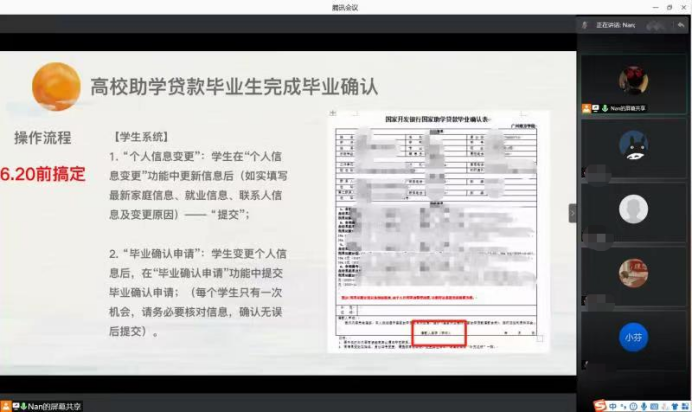 会议伊始,曲楠楠老师从高校助学贷款、生源地助学贷款、提前还款、诚信还款四大板块对办理了助学贷款的学生近期需要完成的事情进行了具体说明,提醒需要变更还款计划的同学及时变更,及时在线上完成毕业确认工作。同时,曲楠楠老师建议大家,在条件宽裕的情况下,同学们可以在计息时间开始前(9月前)将贷款一次性还清,免还贷款利息。