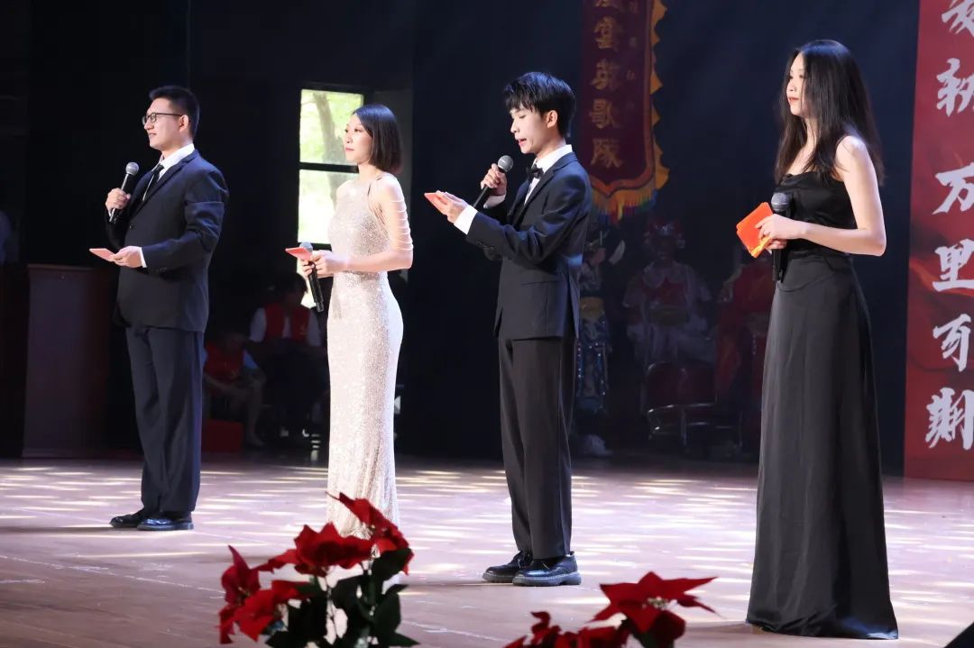 伴随着舞台灯光亮起,4位主持人惊艳亮相,他们分别是我院辅导员吕占宇老师、辅导员王清楠老师、大四学生丘茂羿同学、大一学生黄雅倩同学。