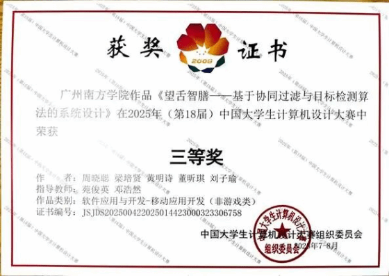 2025年7月27-31日,第18届中国大学生计算机设计大赛软件应用与开发全国总决赛在山东泰山学院圆满落下帷幕。本届赛事涵盖移动应用开发(非游戏类)、算法设计与应用、软件应用与开发专项赛、管理信息系统、Web应用与开发五大类别。经过层层选拔,全国31个省市458所高校的714项作品脱颖而出,进入到了全国总决赛,其中我院团队凭借优异表现,最终荣获“软件应用与开发-移动应用开发(非游戏类)”全国三等奖。
