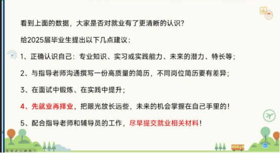 最后,学工办主任唐玉婷老师结合当前的就业形势,强调了就业的重要性,建议毕业生应积极规划自己的职业发展道路,早做准备。