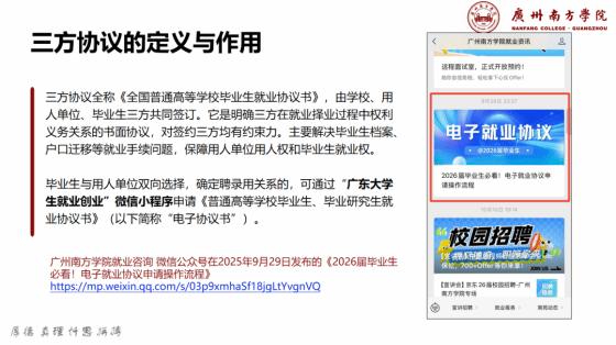 紧接着,徐慧玲老师从“增强就业竞争力”角度助力积极就业,详细介绍优秀毕业生、卓越工程师等评优项目申报条件,明确“评优是简历‘加分项’”的价值,鼓励同学们通过参与评优、深耕专业知识、积累实践经验提升综合素质;黄倩敏老师则拆解电子就业协议签订全流程,以“广东大学生就业创业”小程序操作为例,让同学们掌握协议签订要点,消除就业手续障碍,为积极求职扫清实操阻碍。