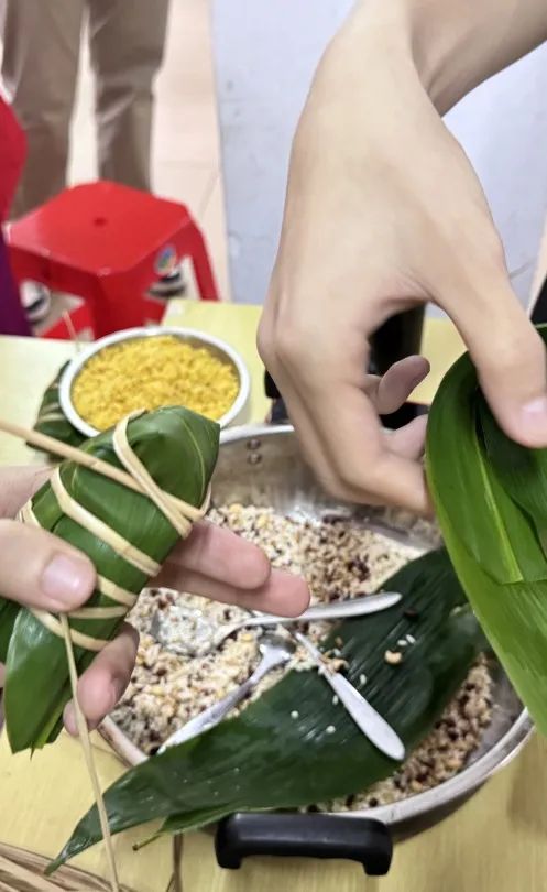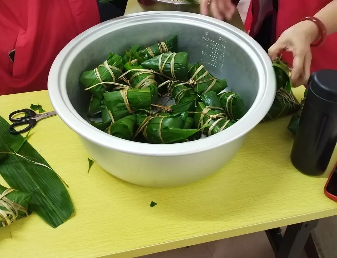 社区阿姨们耐心教同学们如何包粽子,整个过程当中,欢声笑语不断。初学者们认真学习阿姨们的包粽子手法,在形式和内容相同的情况下,“各展千秋”包出了“千奇百怪”的形状。好在社区阿姨们耐心教学,同学们认真改进,最终一个个碧绿清香的粽子摆满了桌面。