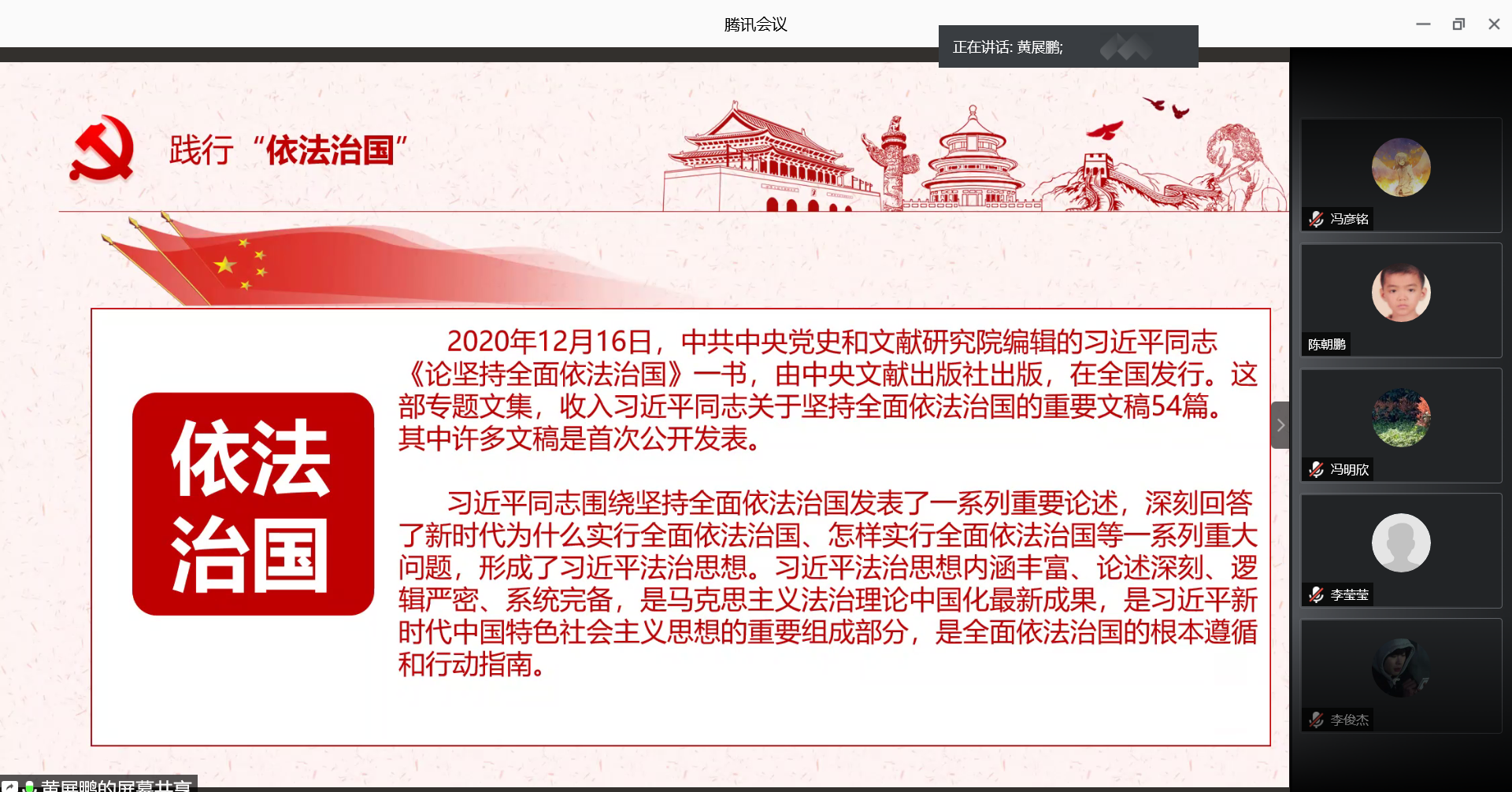 黄展鹏同志以时间为基础,介绍了1989年到1999年期间依法治国的发展历程,体现了“依法治国”的长期性,并号召各位党员同志和积极分子学法、守法、用法。