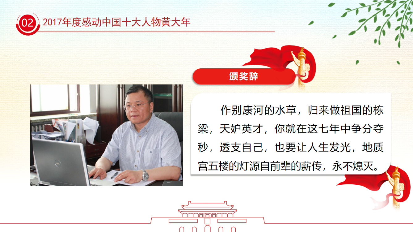 颁奖辞: 作别康河的水草,归来做祖国的栋梁,天妒英才,你就在这七年中争分夺秒,透支自己,也要让人生发光,地质宫五楼的灯源自前辈的薪传,永不熄灭。