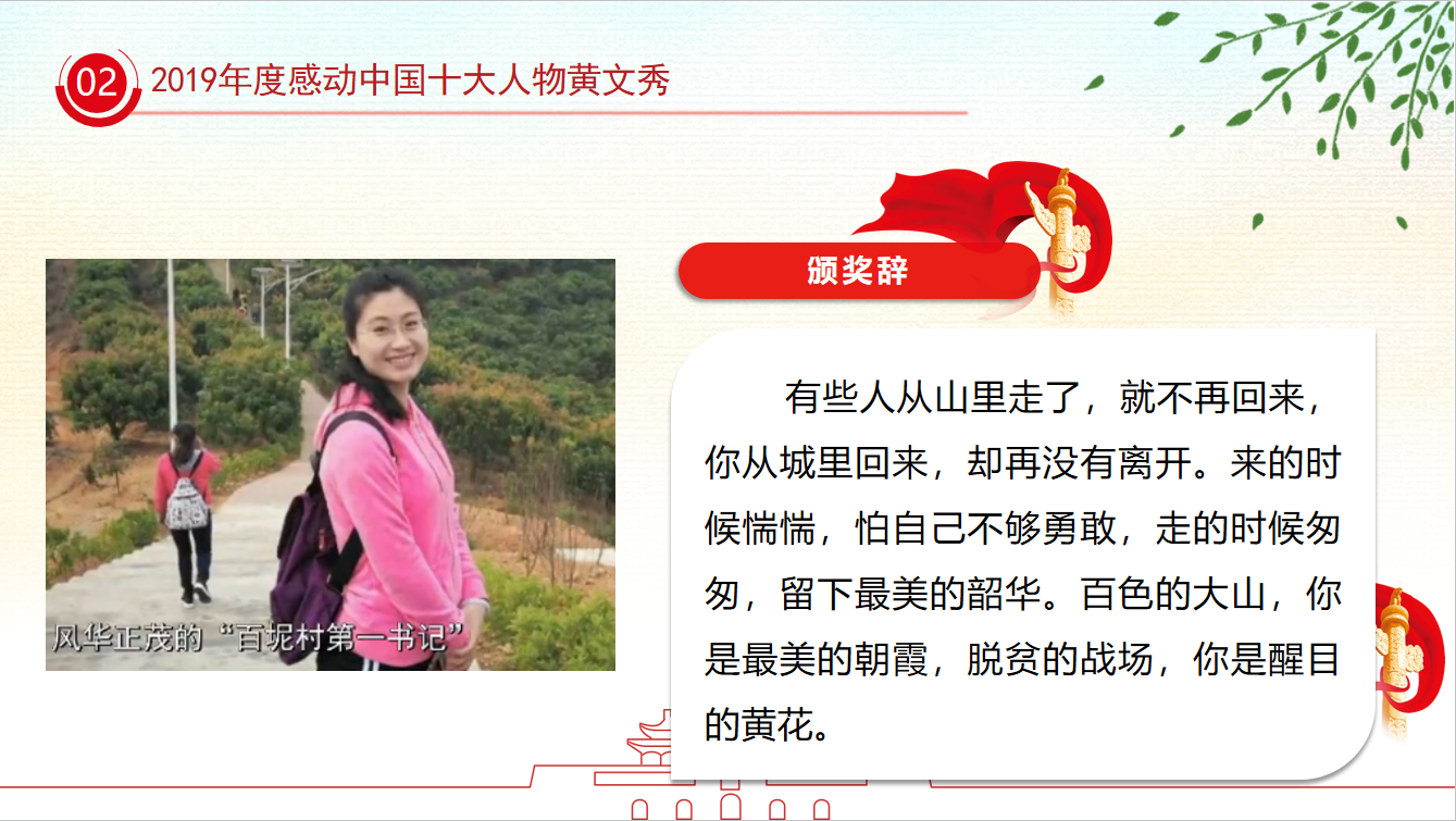 黄文秀是2016年北京师范大学哲学院硕士毕业生,面对精彩的世界,这个从山村走出来的女孩作出了一个与众不同的选择,她决定回到家乡支援建设,2018年担任广西百色乐业县百坭村的驻村第一书记。黄文秀的家庭并不富裕,父亲身患重病,重重压力之下,黄文秀总是乐观开朗、积极向上。