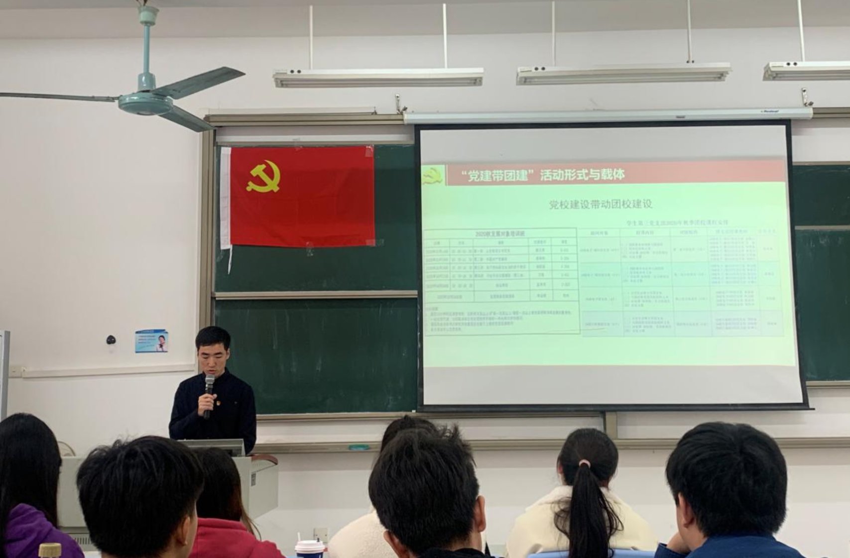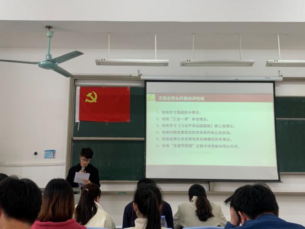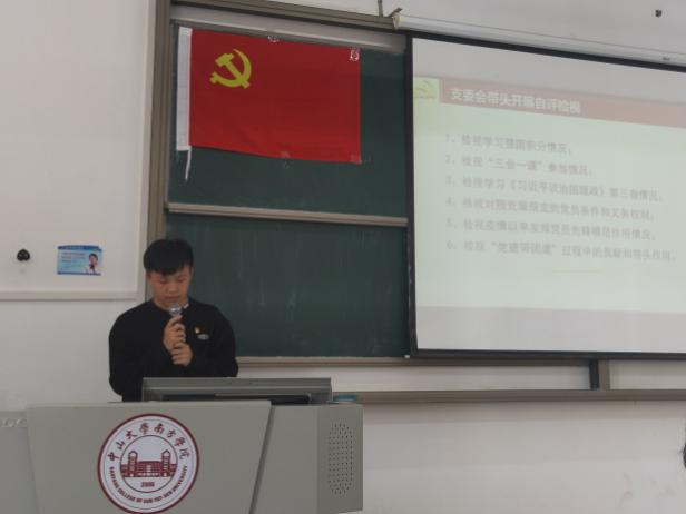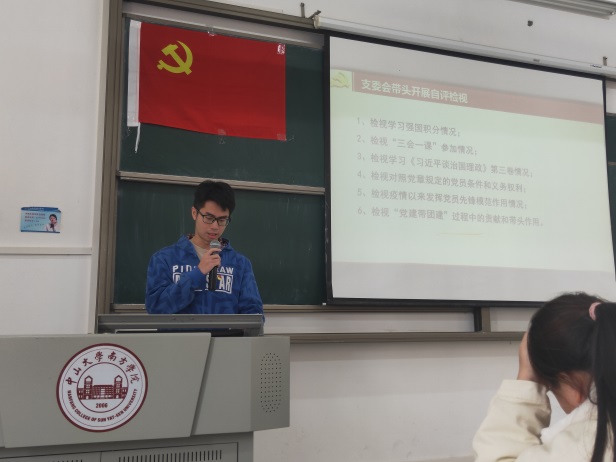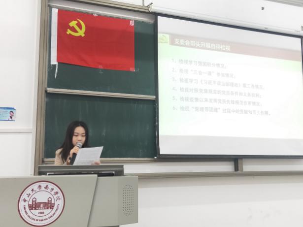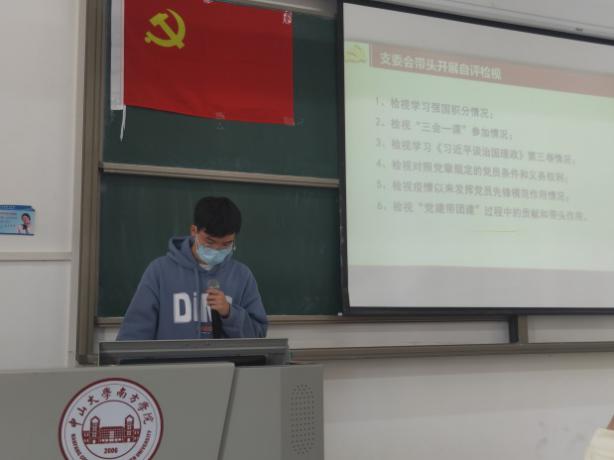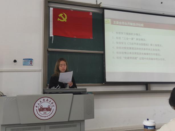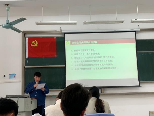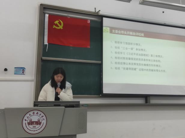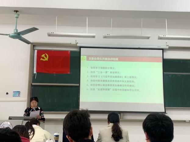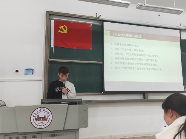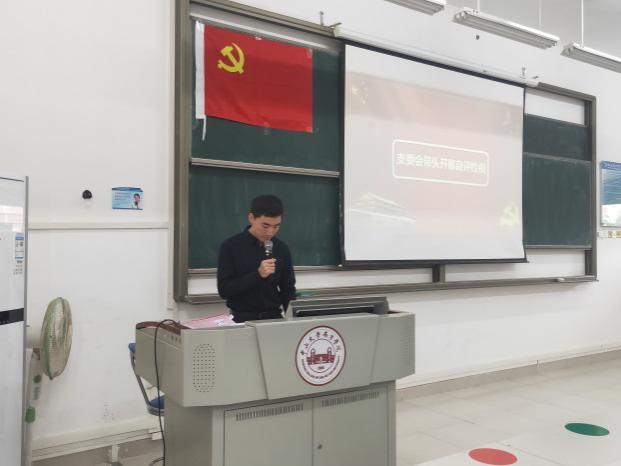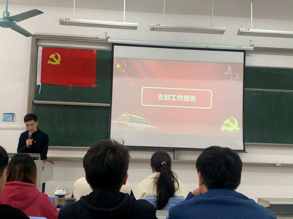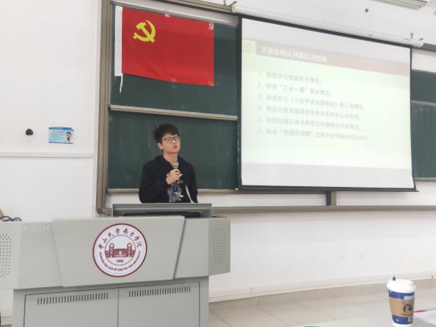 孙大伟老师从“三会一课”制度落实情况、“党建带团建”活动形式与载体、“不忘初心,牢记使命”主题教育系列活动、主题党日活动、党费收缴、学习强国积分和打卡情况、党校团校建设、发展党员工作、宣传工作和公众号传播影响力、支部品牌活动、学生会改革工作、支部成员奖学金获奖情况、志愿服务和社会实践情况等多个方面,向与会人员汇报了这一年来党支部的工作情况。