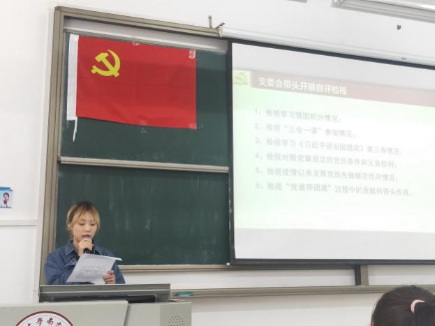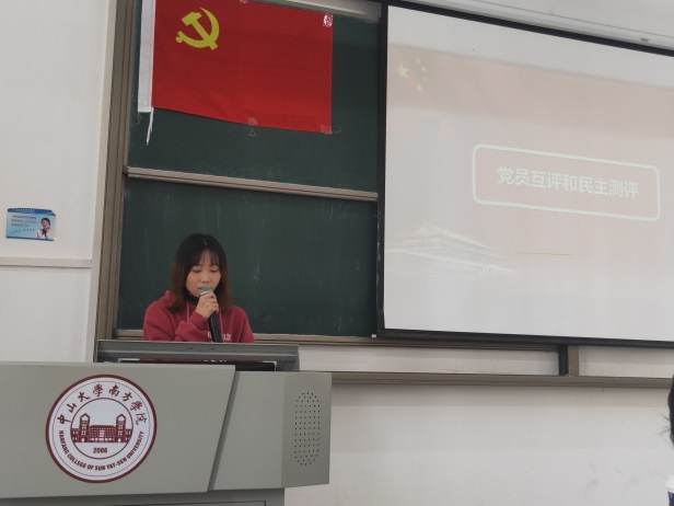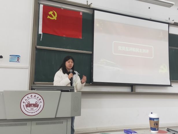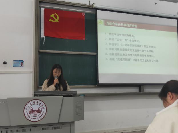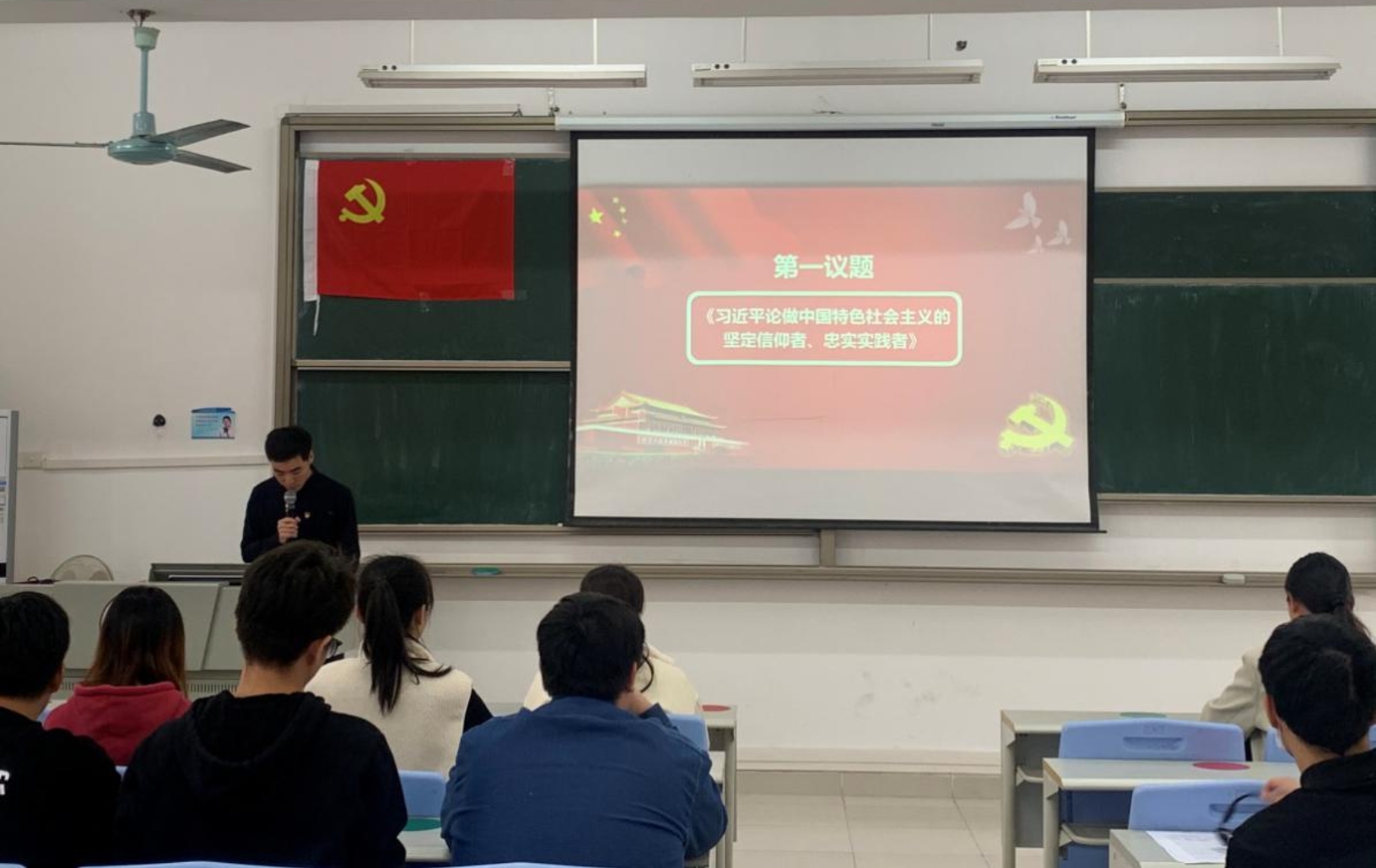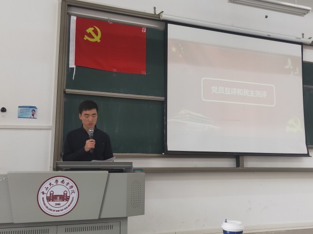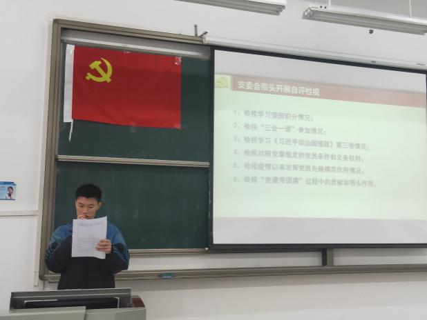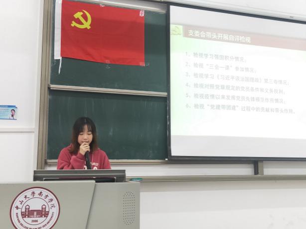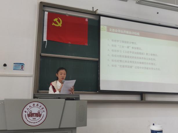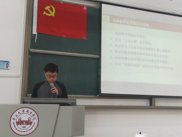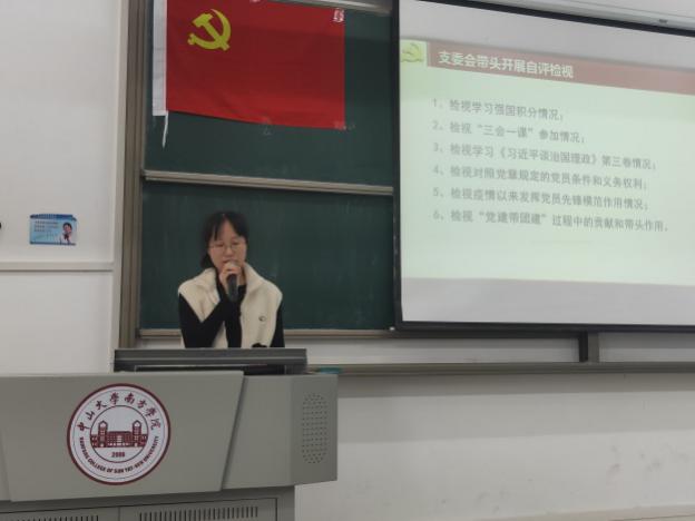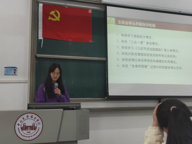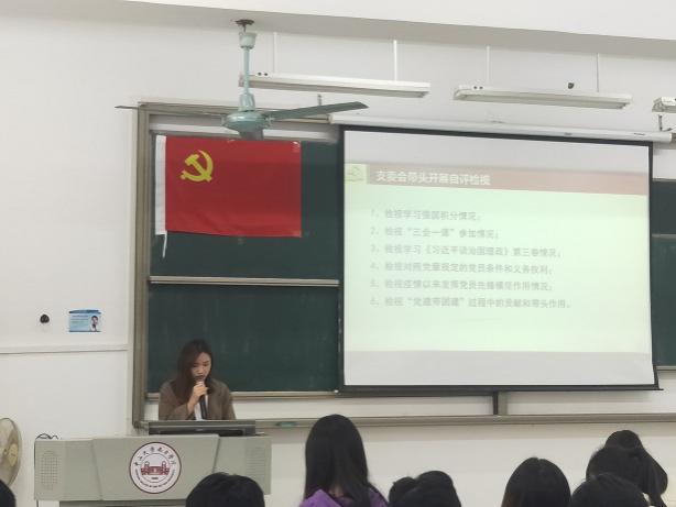 孙大伟老师从“三会一课”制度落实情况、“党建带团建”活动形式与载体、“不忘初心,牢记使命”主题教育系列活动、主题党日活动、党费收缴、学习强国积分和打卡情况、党校团校建设、发展党员工作、宣传工作和公众号传播影响力、支部品牌活动、学生会改革工作、支部成员奖学金获奖情况、志愿服务和社会实践情况等多个方面,向与会人员汇报了这一年来党支部的工作情况。