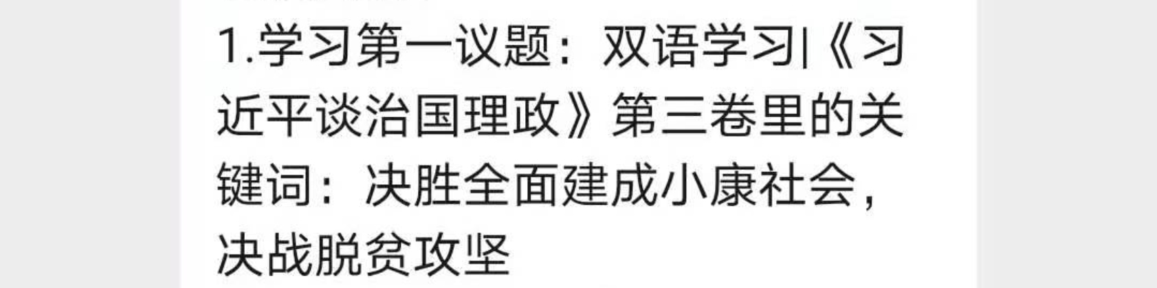 会议第一部分,学习第一议题。由黄慧瑶同志带领大家一起学习《习近平谈治国理政》第三卷里的关键词:决胜全面建成小康社会,决战脱贫攻坚。本次第一议题的学习让我们知道了脱贫攻坚对于决胜全面建成小康社会的重大意义,同时也对于脱贫攻坚战的主要做法、重大成就以及在脱贫攻坚伟大实践中积累的宝贵经验有了更深刻的认识。
