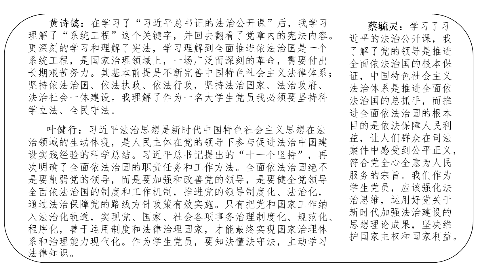 12月4日是国家宪法日,宪法是国家的根本大法,是治国安邦的总章程。宪法具有最高法律效力,所有法律、法规都不得同宪法相抵触。作为大学生党员,我们应该不断加强对于宪法的了解和学习,因此会议第二部分首先是由黄诗懿同志带领所有组员一起学习“习近平的法治公开课”,并在课后总结交流自己的所学所想,最后由黄诗懿同志做总结。