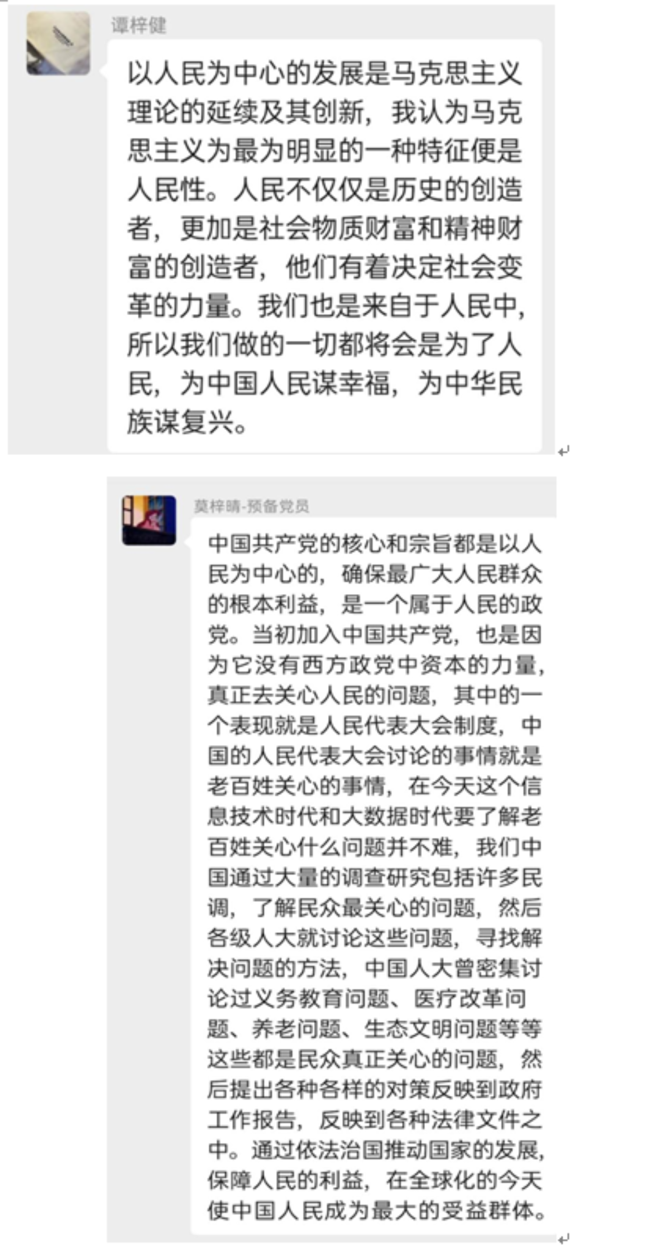 杨秋琳 :中国共产党自建党以来,始终以实现人民的利益为核心追求,以全心全意为人民服务为宗旨,将实现好、维护好、发展好最广大人民的根本利益作为党和国家一切工作的出发点和落脚点。建党以来“以人民为中心”发展思想一以贯之,从未改变。特别是最近几年来,始终秉持“以人民为中心”的情怀,对群众生活的点点滴滴都特别关注,不论是“精准扶贫”还是“美丽乡村建设”,不论是“减税降费”,还是“民生兜底保障”,一个个圆梦工程铺展宏图,一项项民生工程落地生根,一桩桩利民政策持续发力都彰显民生情怀、饱含对民生的关切,响应以人民为中心的宗旨。而习近平说的“我将无我,不负人民”,真切地表达了一个东方大国领袖对人民的无限担当,对自我的严格要求,这也是中国共产党人的最高境界。