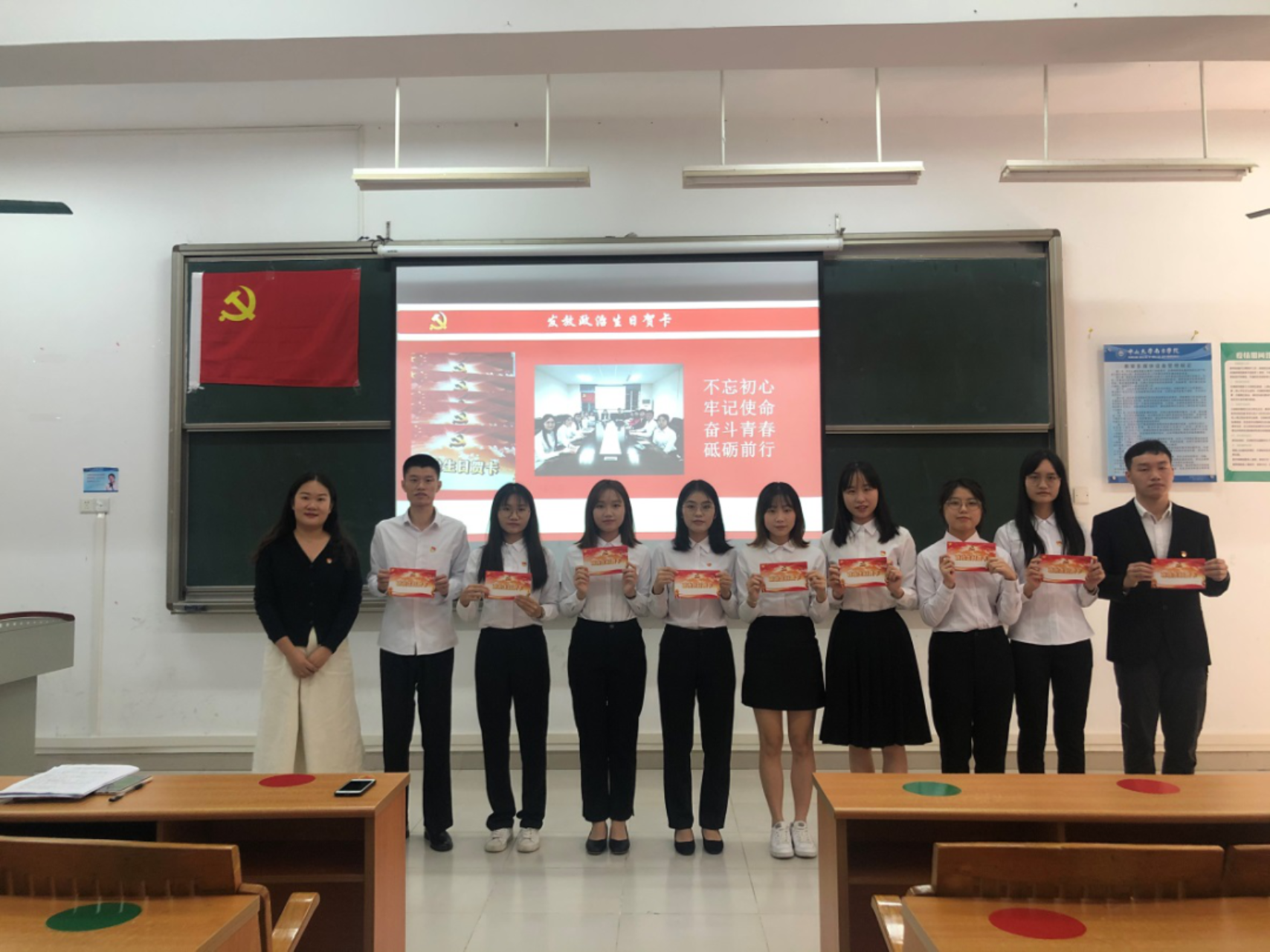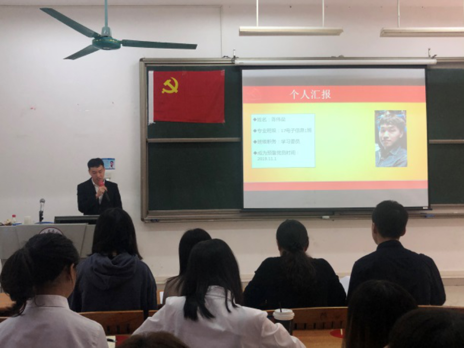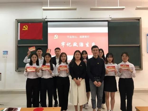 而后孙大伟老师主持“过政治生日、忆入党初心”主题活动,为2019秋季预备党员过政治生日,通过幻灯片展示了9名党员的精神面貌,孙老师送上寄语希望大家不忘初心、牢记使命、奋斗青春、砥砺前行。