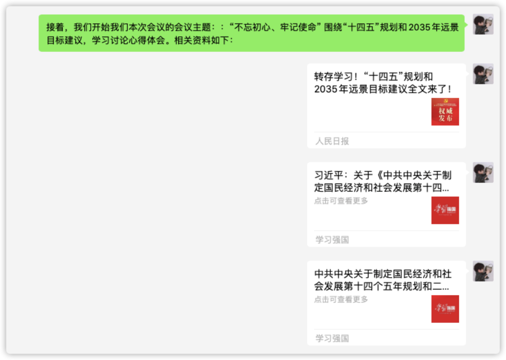 通过本次会议,党小组内的每位党员同志都互相分享了关于“十四五”规划和2035年远景目标建议的学习心得,作为学生的我们,就应该紧跟党的脚步,密切联系群众,做好十四五规划的先锋带头作用,为建设全面小康出一份力,只有全国人民共同努力,才能够实现这一宏大目标,我们定要努力的为党的建设出一份力,跟着党的路线走,并且把党的精神发扬光大,全心全意为人民服务。