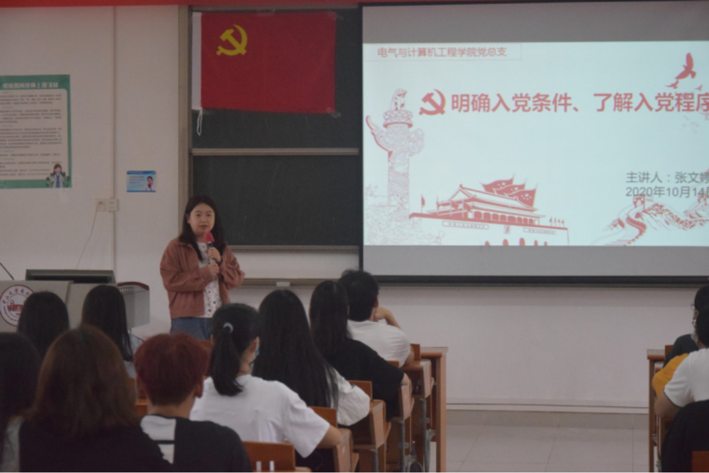 紧接着张文婷老师向大家阐述了入党的基本条件,即“年满18周岁的中国工人、农民、军人、知识分子和其他社会阶层的先进分子,承认党的纲领和章程,愿意参加党的一个组织并在其中积极工作,执行党的决议和按期交纳党费的,可以申请加入中国共产党。”