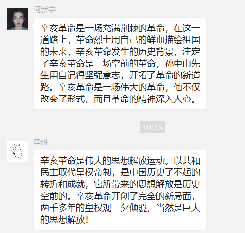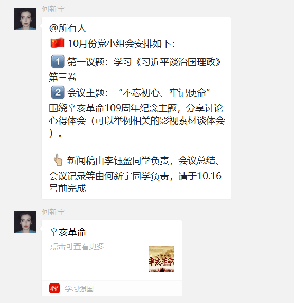 今年是辛亥革命109周年,随着时光的流逝,历史的硝烟已经散尽,但革命精神和革命情怀却永远会留在后人的心中,往往让人不禁悼念。电气学院学生第二党支部第三党小组于2020年10月14日在线上微信群开展围绕辛亥革命109周年纪念主题开展分享心得体会讨论。本次会议由学生第二党支部第三党小组何新宇组织,李钰盈、李琳、谢晓煌共同参与。