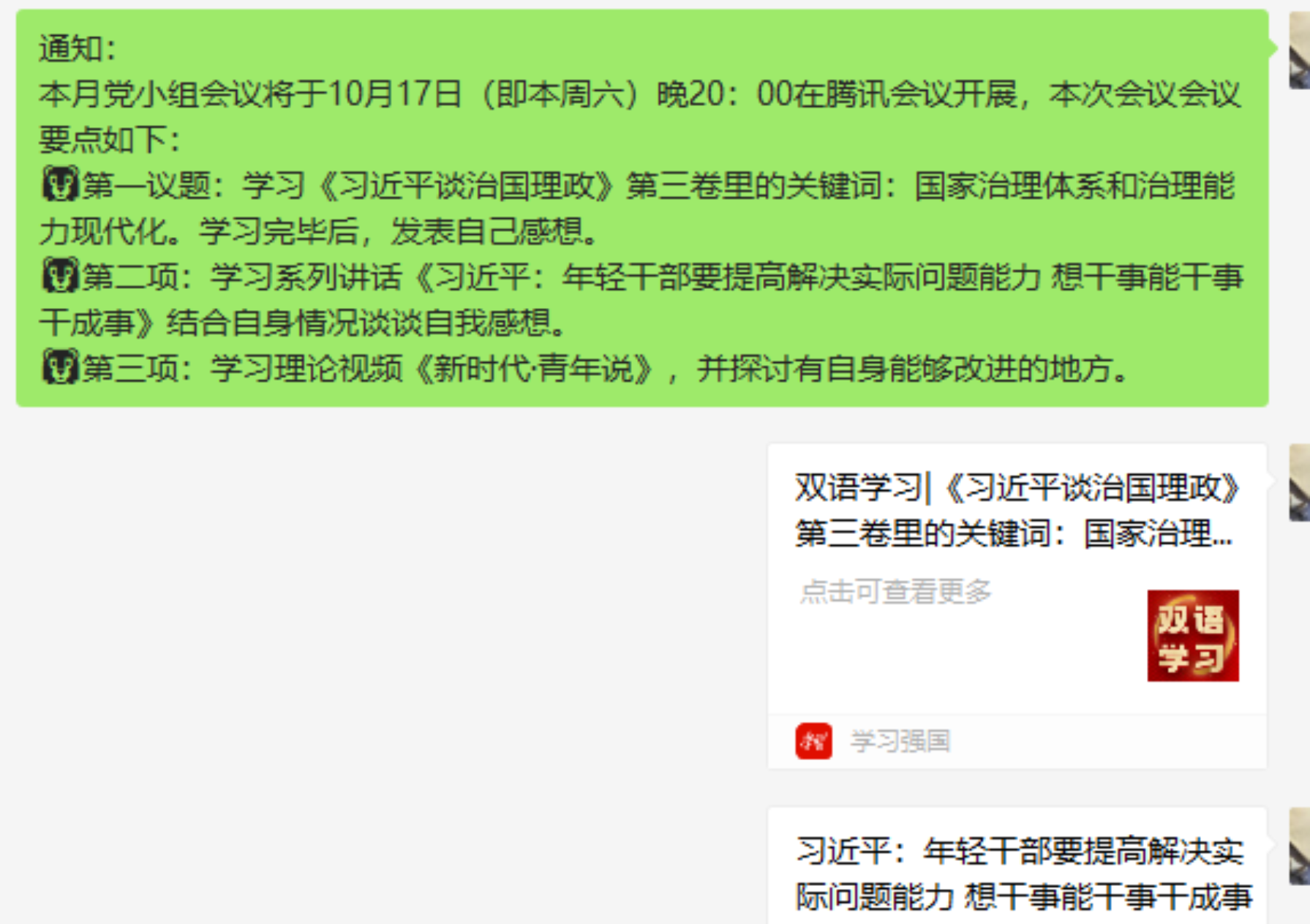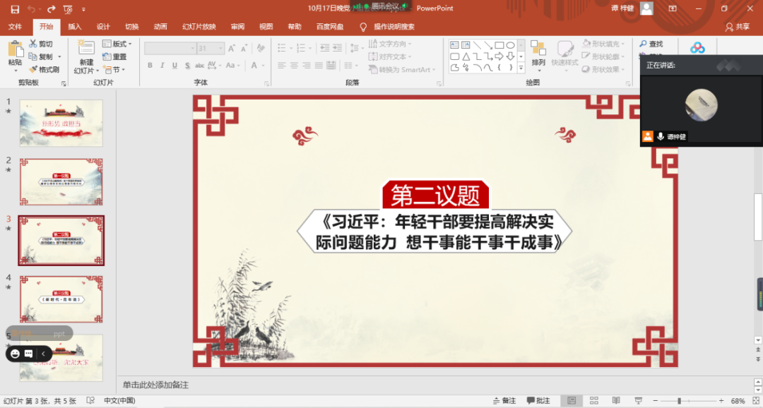 由谭梓健同志带领各同志学习第二项,带领大家一起学习学习系列讲话《习近平:年轻干部要提高解决实际问题能力 想干事能干事干成事》。于2020年10月17日在腾讯会议平台上进行交流分享,并且结合自身实际情况谈谈的心得。