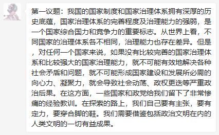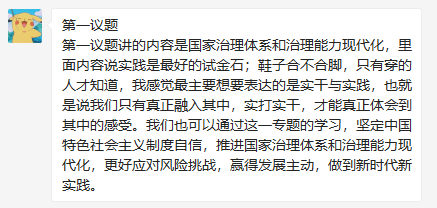 10月18日晚8点学生第三党支部第四党小组全体学生成员在腾讯会议平台上由谭梓健同志带领大家一起学习第一议题:《习近平谈治国理政》第三卷里的关键词:国家治理体系和治理能力现代化,并在学习完毕后,发表自己感想。