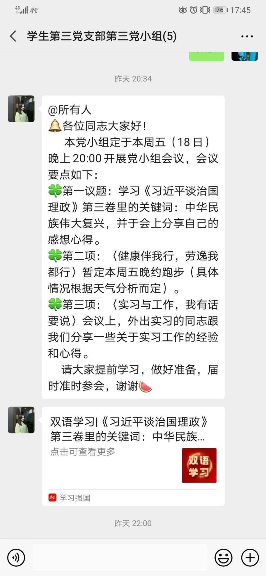 通过本次党小组会议的学习、活动及实习工作就业经验分享,我们从关键词中华民族伟大复兴中各有所思,但也各有所同。归根结底复兴离不开奋斗,我们每个人的奋斗,凝聚起来就是一个国家的复兴。环校跑虽在跑的中途下起了小雨,但跑步氛围很好,大家分享了一些自己上课学习或工作中的一些趣事,此次跑步很好的缓解了学习的压抑,也增进小组内成员的友情。丽敏同学的经验分享对于即将走向社会的我们是很有参考意义的,通过对如何找工作,薪资问题及公司选择问题的经验分享,扫除了我们心中的一些困惑与焦虑,对不久的将来更加充满信心。