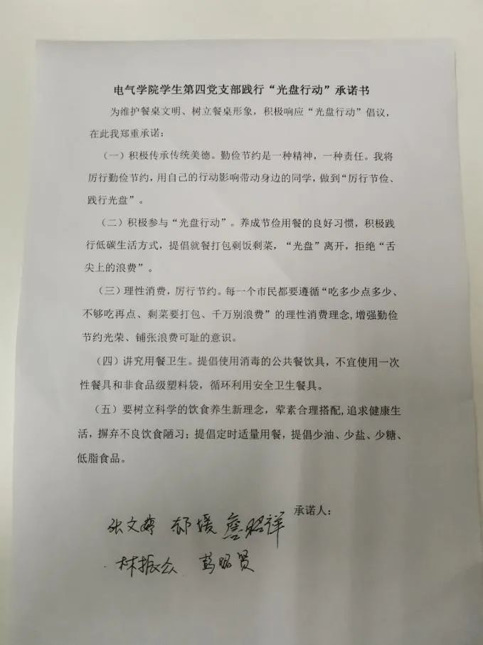 具体到党小组上,我们小组讨论将通过“承诺书”的形式参与到反对食物浪费的行动中。会上,郝媛同志组织大家一起阅读承诺书,进一步加深了我们对于此次活动的理解。我们在承诺书的最后写下自己的名字,表明自己一定是“光盘行动”的践行者与带头者。