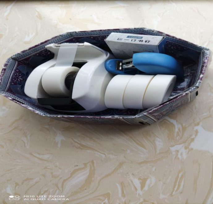 刘涵:平时用坏了的数据线,还有吃完的零食盒,将数据线穿过盒子,并且打个结,可以当放杂物的小篮子,环保省空间。