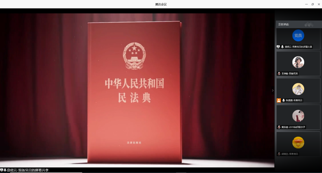 8月23日晚上9:00,学生第三党支部第一学习小组全体党员同志和入党积极分子在腾讯会议平台上开展学习会议,进行了一系列的学习,由盘晓云同志带领大家一起学习《中华人民共和国民法典》的相关文章和相关视频的观看,并在会中带领大家一起讨论分享。