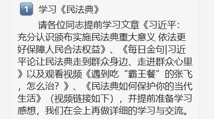 为了贯彻学习我国成立以来的的第一部成文法典化法律——《中华人民共和国民法典》。学生第三党支部第一学习小组于2020年08月23日21:00积极利用腾讯会议平台,开展了线上主题学习会。本次会议主要以线上学习和感想交流的方式开展学习了《中华人民共和国民法典》的相关内容。