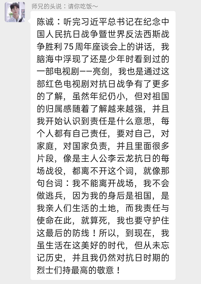 会议第二环节,“不忘初心、牢记使命” 结合习近平总书记在纪念中国人民抗日战争暨世界反法西斯战争胜利75周年座谈会上的讲话,分享讨论心得体会。