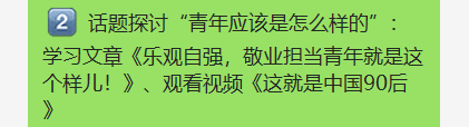 紧接着,由王靖愉同志继续带领大家一起学习新文章:《乐观自强,敬业担当青年就是这个样儿!》、观看视频《这就是中国90后》,并带领大家一起谈谈各自的思考和感想,探讨“青年应该是怎么样的”的话题。