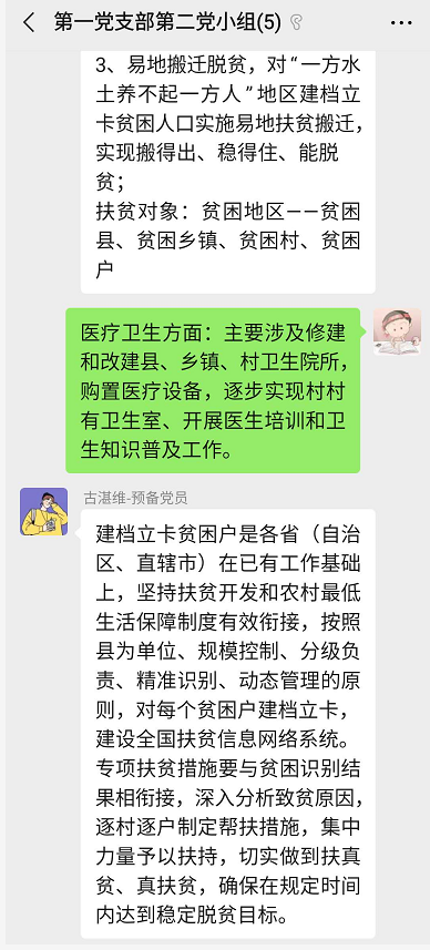 为了贯彻落实习近平总书记关于打赢脱贫攻坚战的重要指示精神。2020年07月21日21点00分,电气学院学生第一党支部第二党小组,在微信上举行了线上党小组会议,进行了关于“决胜脱贫攻坚战”的讨论学习。