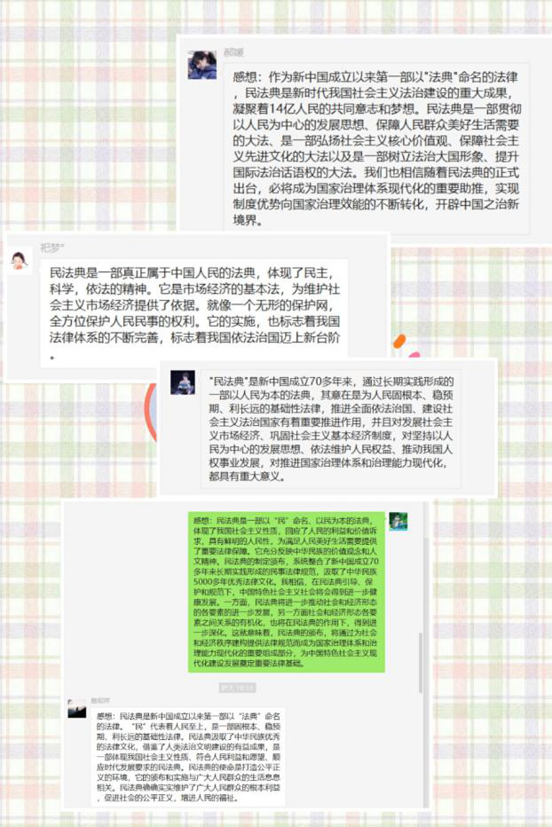 会议伊始,郝媛同志组织大家进行学习“习近平:充分认识颁布实施民法典重大意义 依法更好保障人民合法权益”文章,以及组织在学习后分享各自的见解和感想。本次文章展示了实施民法典重大意义。在学习文章后大家畅所欲言,都陆续在微信通话中语音分享自己的见解和感想。