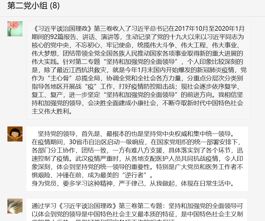 2020年8月13号20:00,电气学院教工党支部第二小组在腾讯会议上开展了党小组会议。本次会议由程佳兵同志主持,除黄宁同志缺席其余同志均参加了本次会议。本次会议就学习《习近平谈治国理政》第三卷第二专题:坚持和加强党的全面领导。