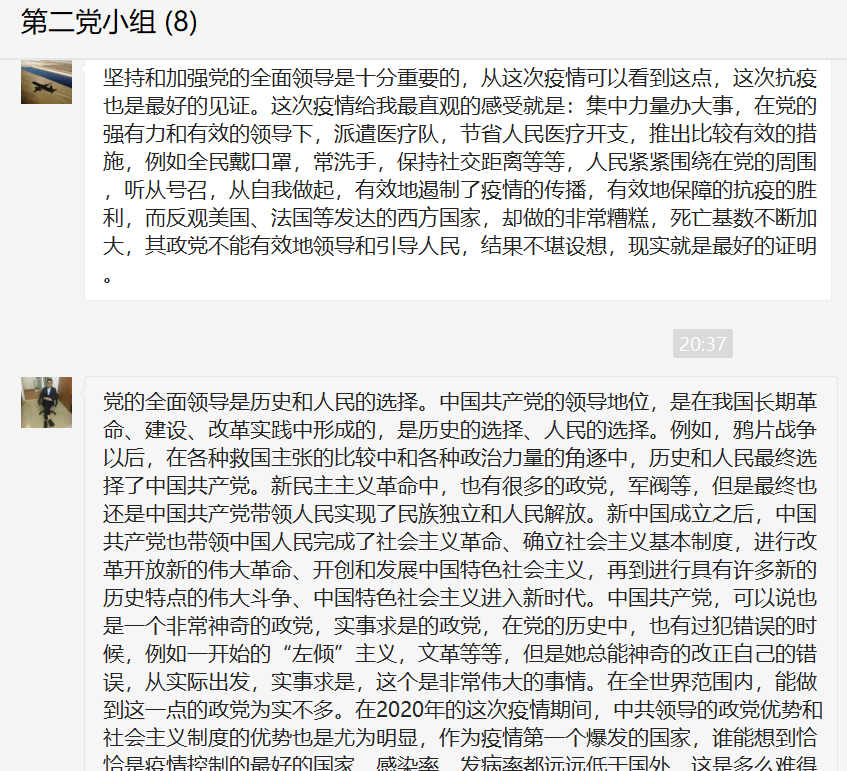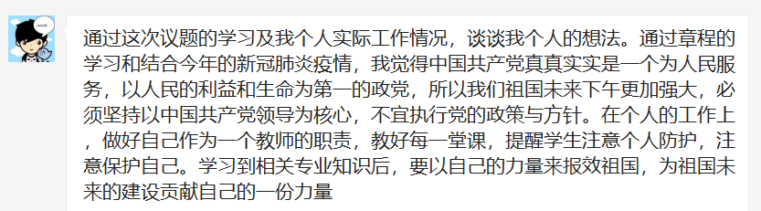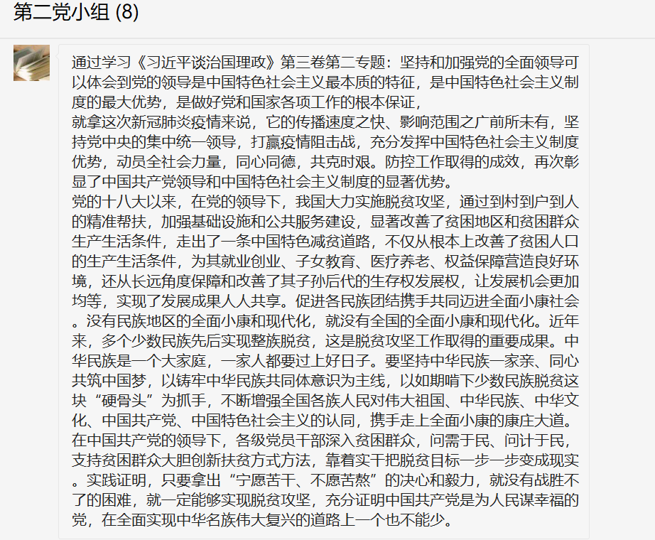 党的十八以来,确立了习近平总书记党中央的核心、全党的核心地位。在党章和宪法中更加明确了党在中国特色社会主义事业中的领导核心地位。完善坚持党的全面领导的体制机制。坚定不移推进全面从严治党。新时代统揽伟大斗争、伟大工程、伟大事业、伟大梦想,战胜各种风险挑战,对健全党的全面领导制度提出了新的更高的要求。党的十九届四中全会立足于健全总揽全局、协调各方的党的领导制度体系,明确提出6个方面主要任务。即:建立不忘初心、牢记使命的制度;完善坚定维护党中央权威和集中统一领导的各项制度;健全党的全面领导制度;健全为人民执政、靠人民执政各项制度;健全提高党的执政能力和领导水平制度;完善全面从严治党制度。这6方面的工作部署,既是历史经验也是顺应时代要求、实践发展和人民群众期待的新的制度安排,是健全党的全面领导制度的基本遵循,必须进行落实,有效的转换为国家制度优势和国家治理效能。学习专题后各党员老师在微信群谈学习感想和心得。