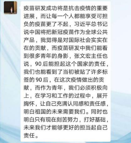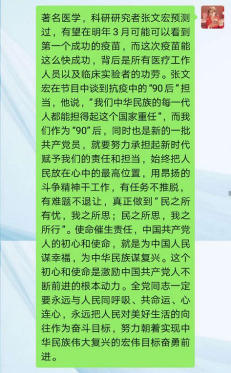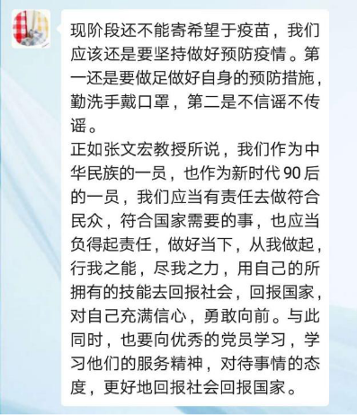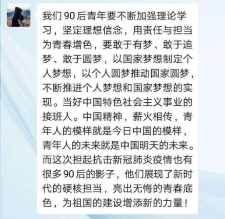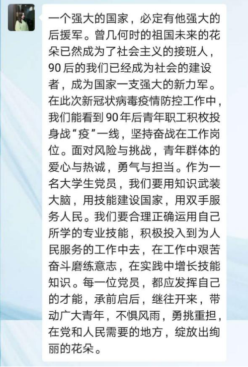 王靖愉 :现在的我们正值青春之年,青春是用来努力奋斗的,而不是用来肆意挥霍的。很多人说“90后是垮掉的一代”,但在这次疫情中,在国家陷入困境之时,涌现了一大批90后优秀青年投身到此次疫情中去帮助他人脱离危难。在短视频中,他们很多是90后的党员,他们正利用自己所学的知识在他人危难之时给予帮助,他们是我们需要看齐的榜样。同样作为90后走在成为党员道路上的我们,即使我们现在还在学校学习,但我们应该更加珍惜这个机会来获取丰富的知识,在生活中寻求更多的机会去帮助他人。