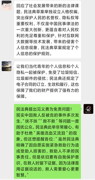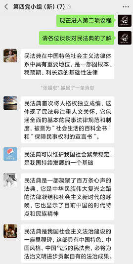 为了进一步学习《民法典》,2020年6月23日12点30分,williamhill中文学生第一党支部第四党小组,在微信上举行了关于学习民法典讨论会。