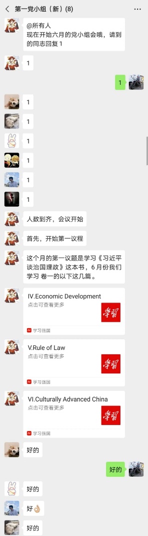 为了更深入地学习“两会”精神。2020年6月21日22:00,电气学院学生第一支部第一党小组,在微信上举行了线上党小组会议,进行了“两会”精神的分享与交流。