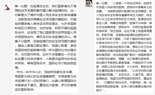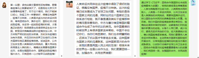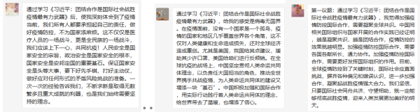 会议宣布开始,组织小组开展题目为《习近平:团结合作是国际社会战胜疫情最有力武器》的学习,大家踊跃发布自己的观点与看法,写下了自己的见解和感想。