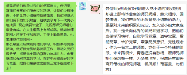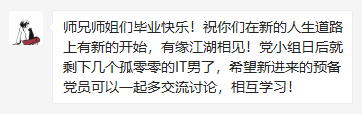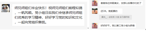 接下来是师兄师妹对毕业生的祝愿以及对党支部以后的规划,预备党员们衷心祝福了师兄师姐们以外,还相互开了开玩笑与调侃,发了自拍照与视频,聊了实习与人生,党小组中充满了自然愉悦的氛围。最后每人都对党支部作了自己的未来规划,一致希望党小组能维持良好的学习氛围,共同营造一个骄傲的家庭。