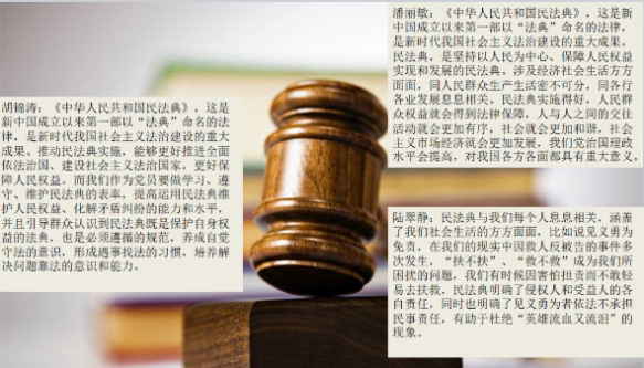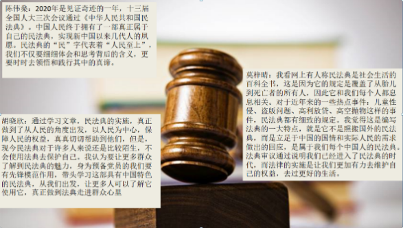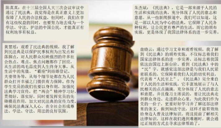 会议第一环节主要由陈真真同志带领大家学习第一议题:《习近平:充分认识颁布实施民法典重大意义 依法更好保障人民合法权益》和《每日金句|习近平论让民法典走到群众身边、走进群众心里》,并和大家一起讨论分享。同时为了让大家更好地了解民法典,在学习完文章之后,观看了一段关于民法典的短视频,小组成员们积极结合自身情况,分享了自己对于民法典的思考和感想。