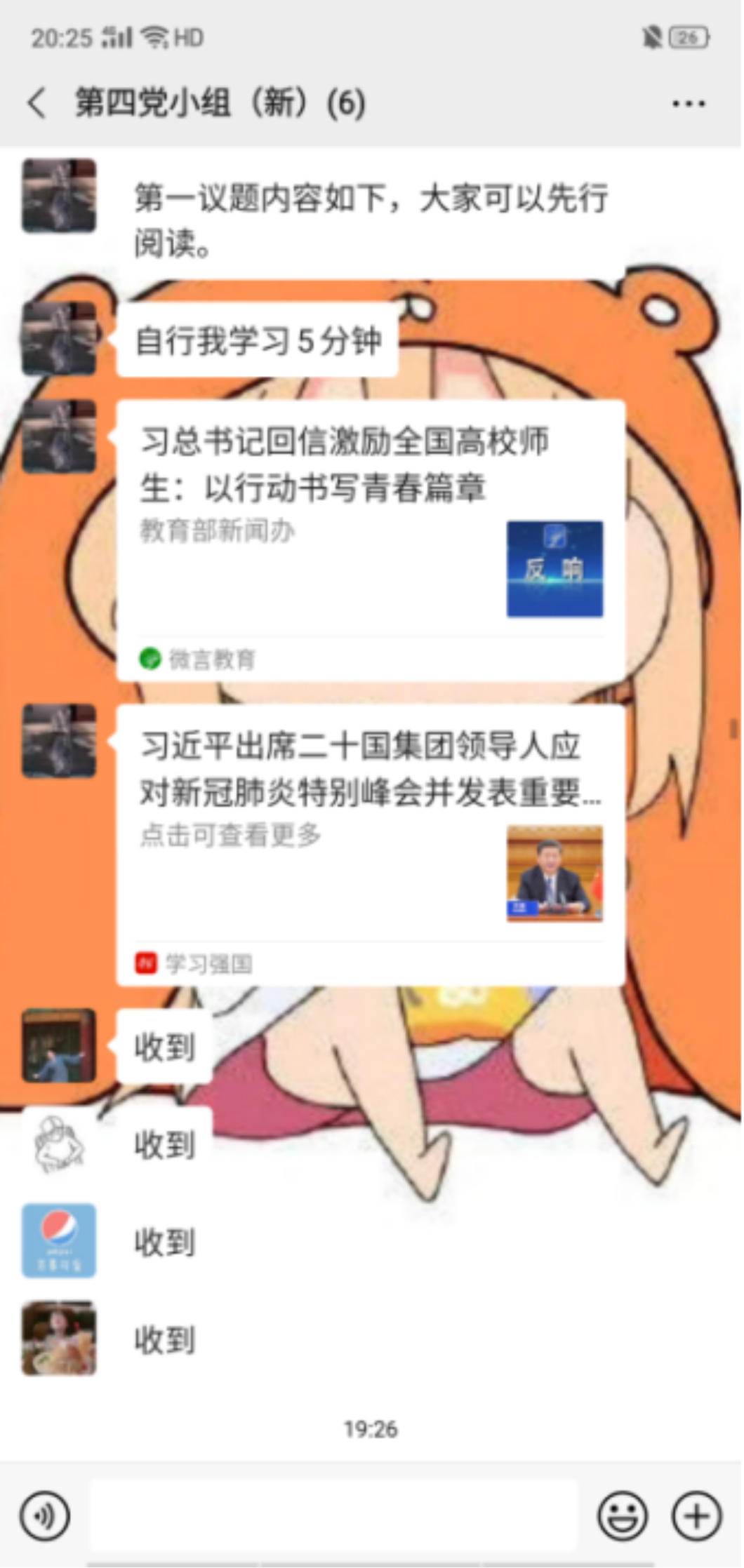 会议第一项:第一议题。学习“习近平出席二十国集团领导人应对新冠肺炎特别峰会并发表重要讲话”以及“习总书记回信激励全国高校师生:以行动书写青春篇章”