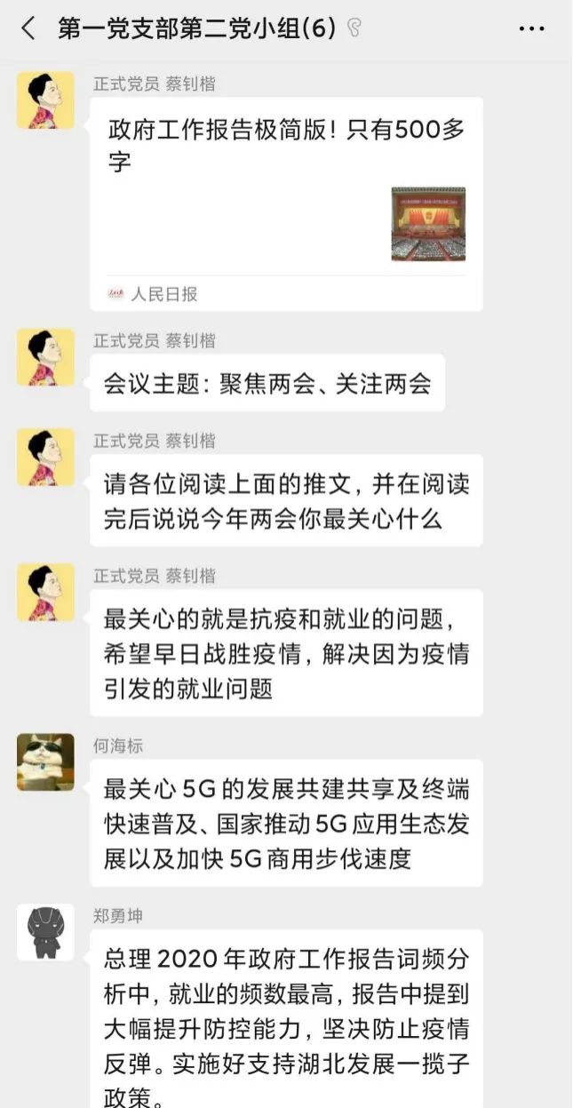 2020年05月22日21:00,电气学院学生第一党支部第二党小组开展线上学习讨论,小组所有成员就“聚焦两会、关注两会”进行学习与讨论。
