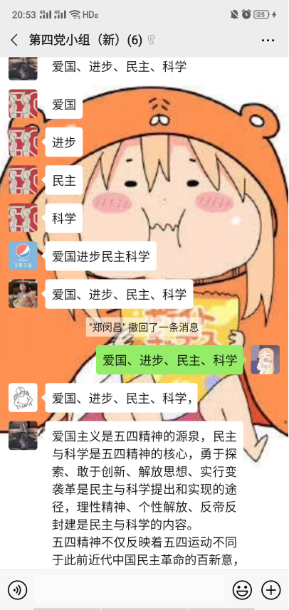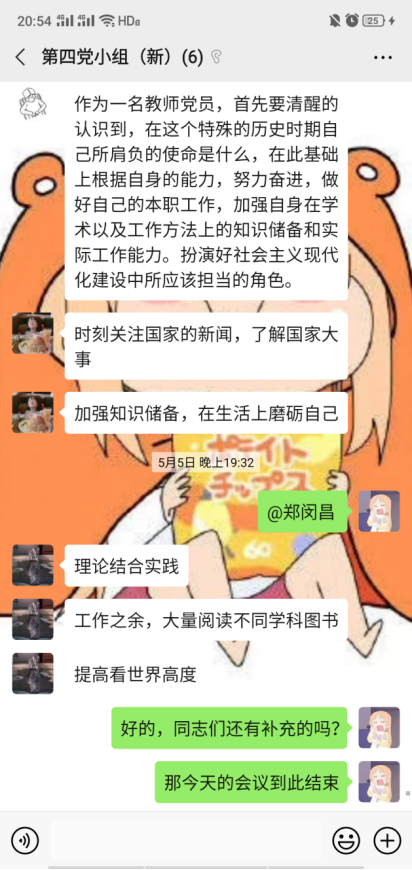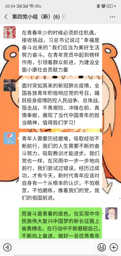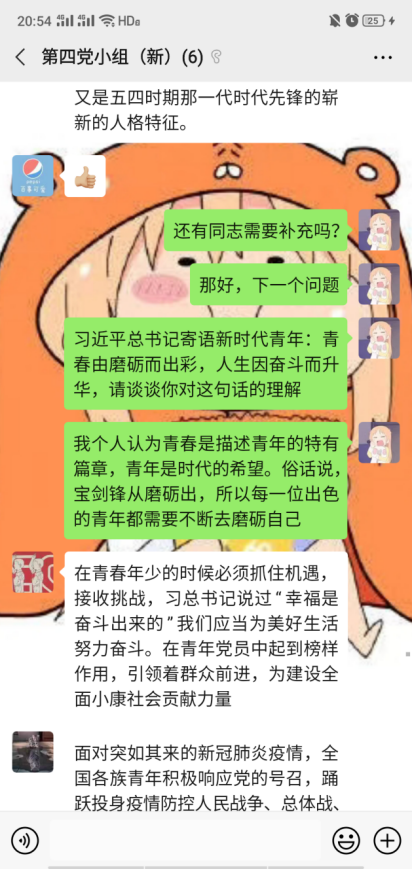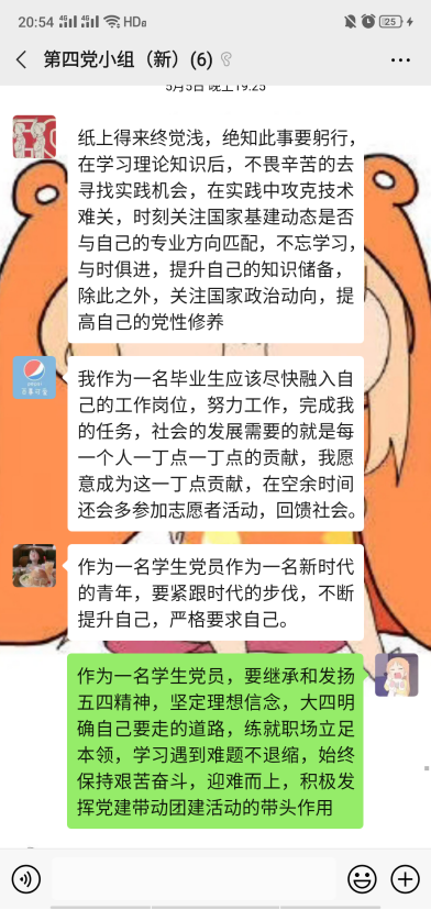 为更好地学深悟透五四精神,由我传承的这一重要内涵。2020年5月5日19:00,电气学院学生第一党支部第四党小组举行线上党小组会议,小组成员各自对此展开学习,阐述自己的看法。