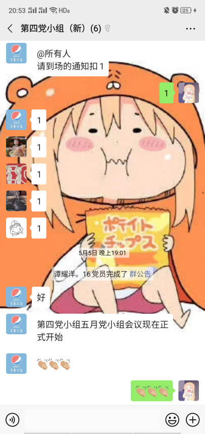 本次党小组会由学生第一党支部第四党小组组长谭耀洋组织,组员黎宇琪协助开展,姜祥祥、陈荣杰、刘施淇、郑闵昌共同参与。