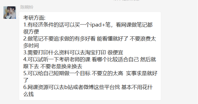 陈婉玲同志分享了考研方面的经验,认为可以给自己做一个短期目标,记笔记的时候不要过于追求完美,自己能够理解即可,视频课程不必要换的太频繁,网课资源可以免费去找平台获取。