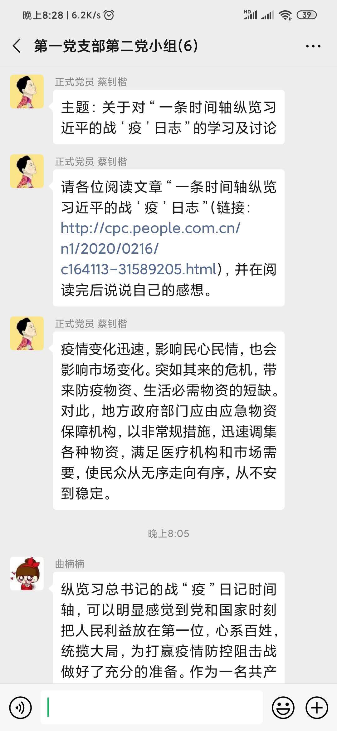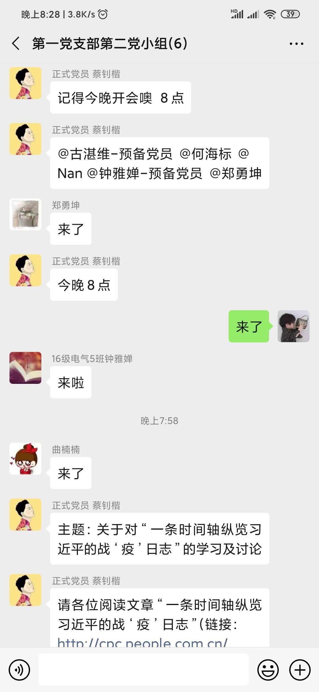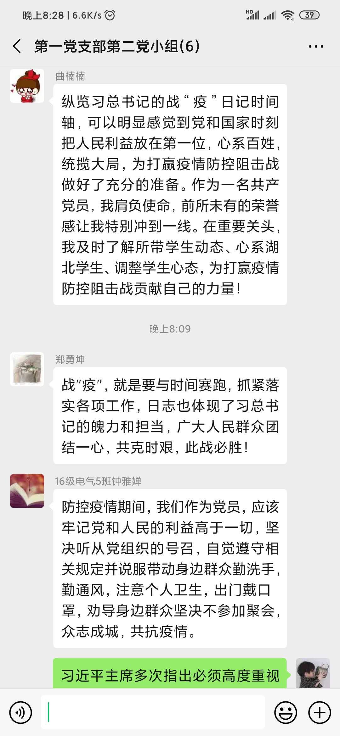 为了进一步落实中共中央发出《关于加强党的领导,为打赢疫情防控阻击战提供坚强坚强政治保证的通知》,充分发挥党员先锋模范作用。2020年02月17日20:00,电气学院学生第一党支部第二小组开展线上学习讨论,小组所有成员通过学习“一条时间轴纵览习近平的战‘疫’日记”,讨论在疫情防控阻击战中,我们应该怎么做。