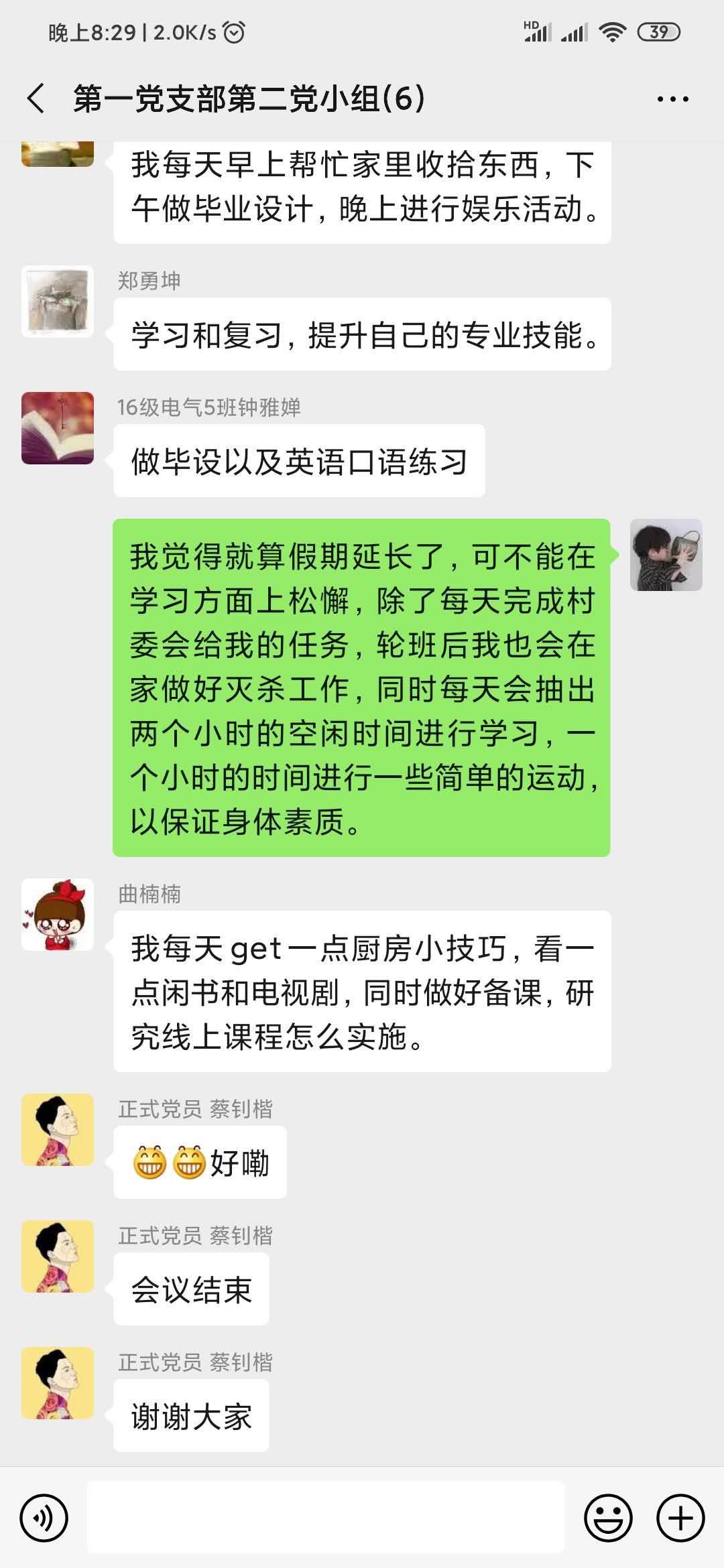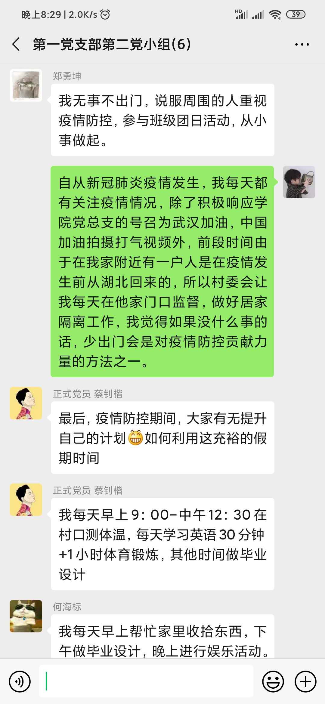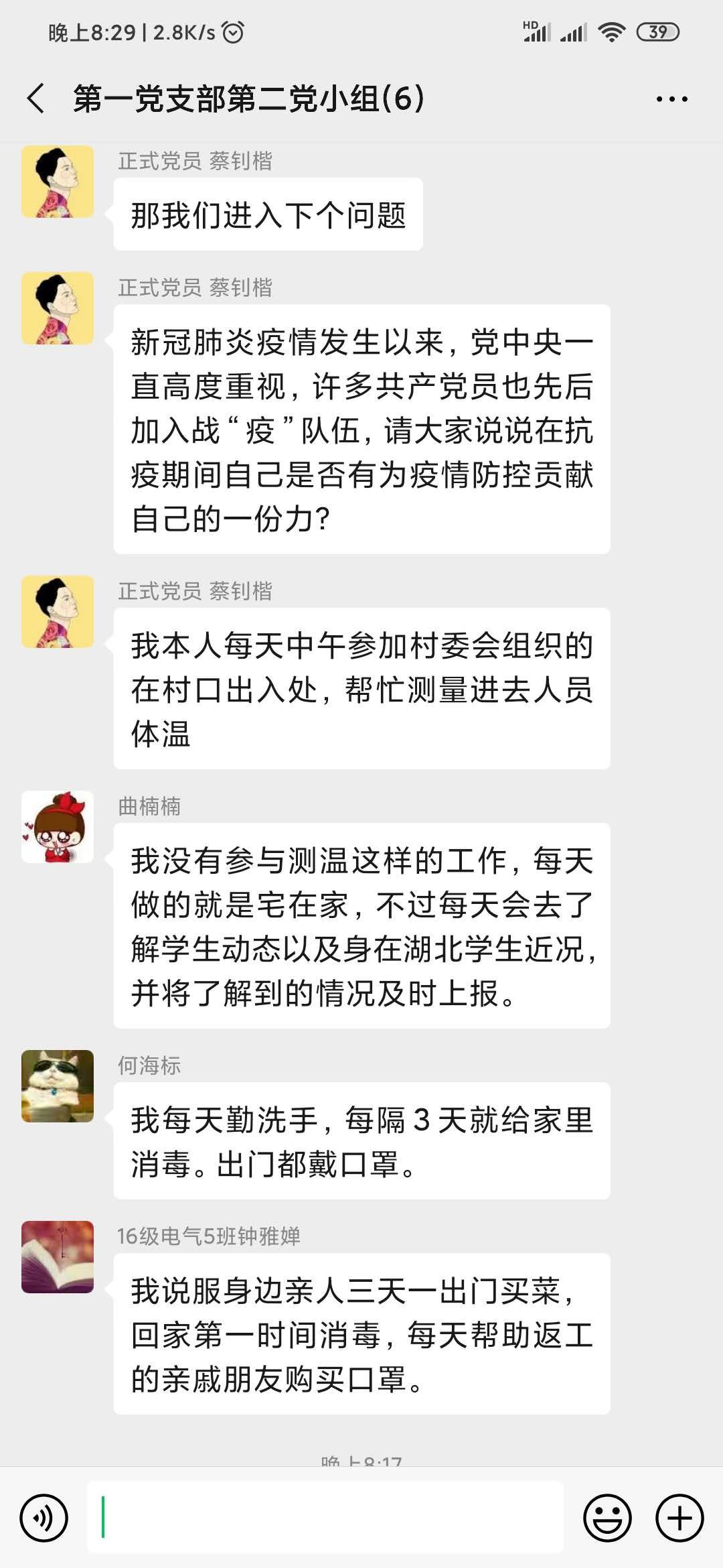 为了进一步落实中共中央发出《关于加强党的领导,为打赢疫情防控阻击战提供坚强坚强政治保证的通知》,充分发挥党员先锋模范作用。2020年02月17日20:00,电气学院学生第一党支部第二小组开展线上学习讨论,小组所有成员通过学习“一条时间轴纵览习近平的战‘疫’日记”,讨论在疫情防控阻击战中,我们应该怎么做。