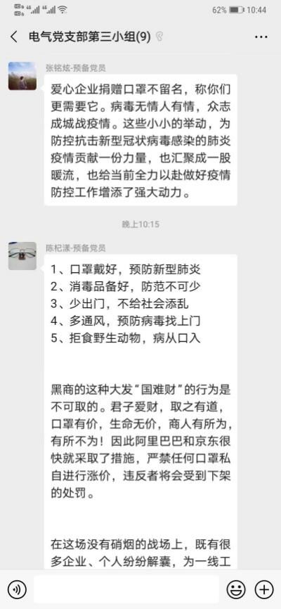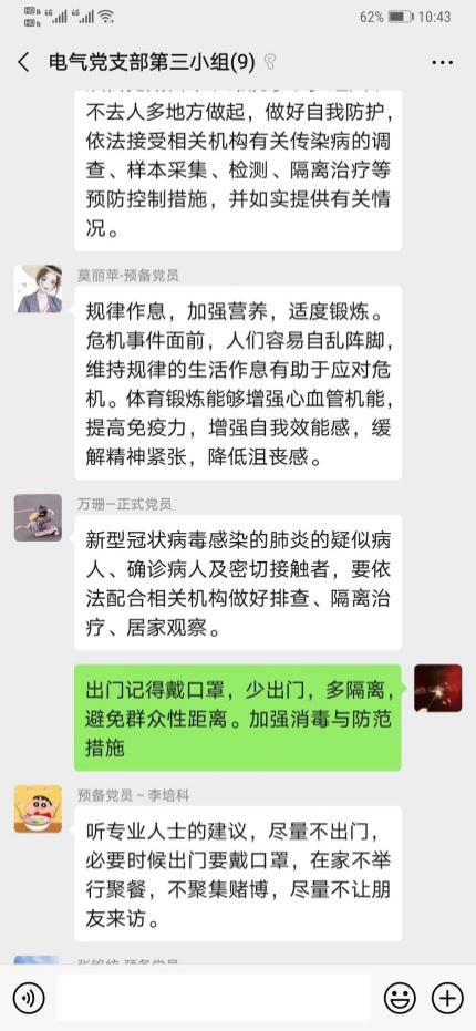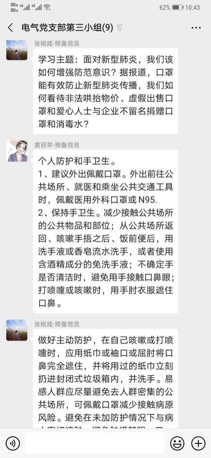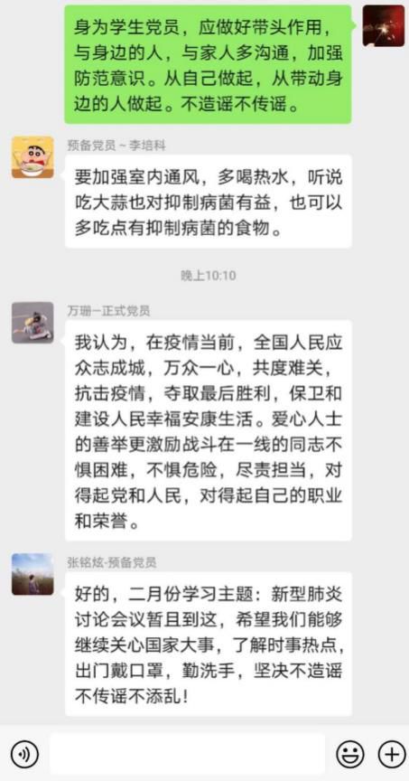 为深入贯彻落实习近平总书记在“不忘初心、牢记使命”主题教育工作会议上的重要指示精神,同时为了在新型肺炎形势严重期间,如何增强我们防范意识。2020年02月19日22点00分,williamhill中文学生第一党支部第三党小组开展线上学习交流疫情期间如何正确有效防范,小组所有成员各抒己见同时结合实际生活,分享防范新型肺炎的小技巧。