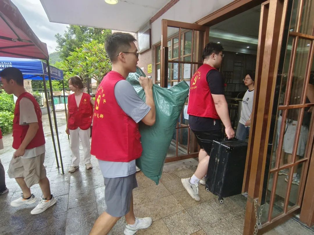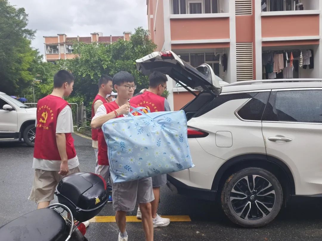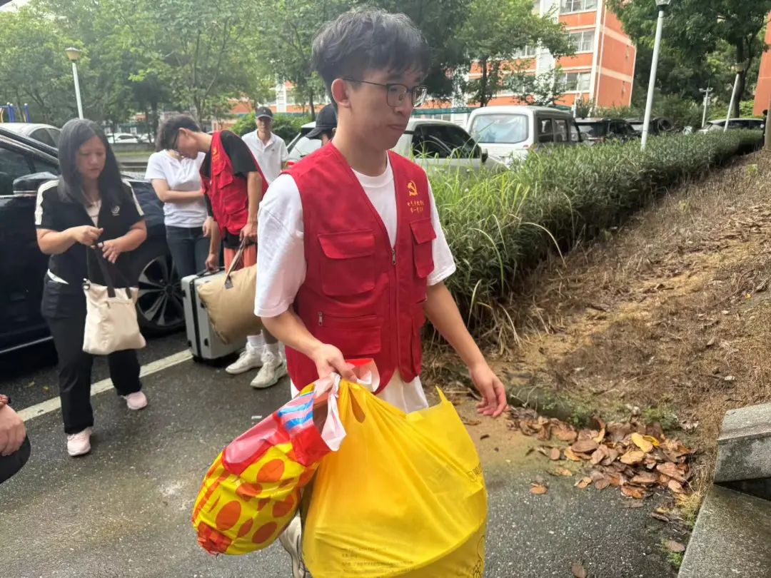 身穿红色马甲的志愿者们热情引导每一位新生办理入学手续,帮助新生搬运行李,为他们指路及答疑解惑,也有志愿者带领新生参观校园,介绍教学楼、图书馆等重要场所,帮助他们熟悉环境。