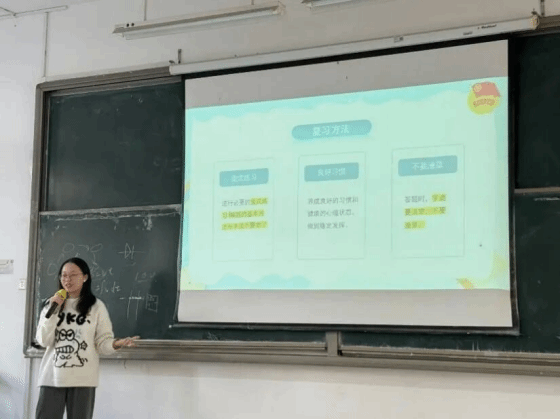 随后,唐欣同志从复习方法、复习安排两个方面详细地讲述了期末备考的要点。首先,要确立复习目标,有的同学是获取优异成绩,而有的同学是追求不挂科就好。对于不同的目标,需要完成的事情也就不同。取得优异成绩的同学应该对自己的期中期末成绩提出更高要求,而保证不挂科的同学就要重视自己的平时成绩。