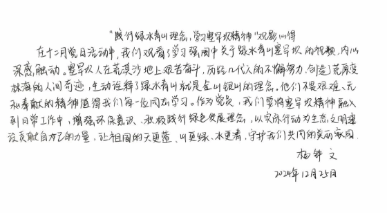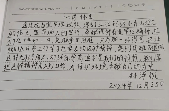 观看了讲述塞罕坝林场发展历程与精神传承的专题视频。视频中,一幅幅震撼人心的画面、一个个感人至深的故事,生动展现了塞罕坝几代人五十多年来在极其恶劣的自然条件下,战风沙、斗严寒、抗干旱,植树造林,将茫茫荒原变成万顷林海的艰苦创业历程。从最初的一棵松到如今的百万亩林海,塞罕坝人用青春、汗水甚至生命,诠释了对绿色梦想的执着追求和对生态文明建设的不懈努力。