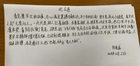 观影结束后,大家表示,塞罕坝精神是一座不朽的丰碑,激励着我们在学习和生活中要勇于面对困难,坚持不懈地追求自己的目标;有的同学提到,塞罕坝的成功经验让我们深刻认识到生态文明建设的重要性和紧迫性,作为新时代的青年学子,我们要从自身做起,积极践行绿色生活方式,为保护环境贡献自己的一份力量;还有的同学认为,塞罕坝精神体现了中国共产党带领人民群众创造美好生活的坚强决心和卓越能力,我们要坚定理想信念,听党话、跟党走,在实现中华民族伟大复兴的征程中绽放青春光彩。